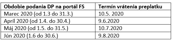 Veľmi často kladenou otázkou, ktorá nebola pre mnohých z nás úplne jasná je aj otázka vrátenia daňových preplatkov z podaných daňových priznaní za rok 2019. V odseku § 10a sa táto otázka jednoznačne objasňuje: “Daňový preplatok na dani z príjmov, ktorý si daňový subjekt uplatní v daňovom priznaní k dani z príjmov podanom počas obdobia pandémie, správca dane daňovému subjektu vráti do 40 dní od konca kalendárneho mesiaca, v ktorom daňový subjekt podal daňové priznanie k dani z príjmov.“ Termíny sú teda nasledovné: